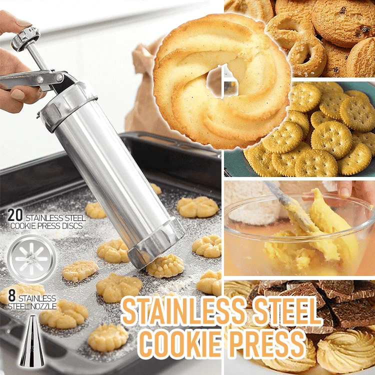 Except the cookie press, the cookie press set comes with 20 sturdy stainless steel cookie press discs & 8 steel nozzle to meet your different needs.