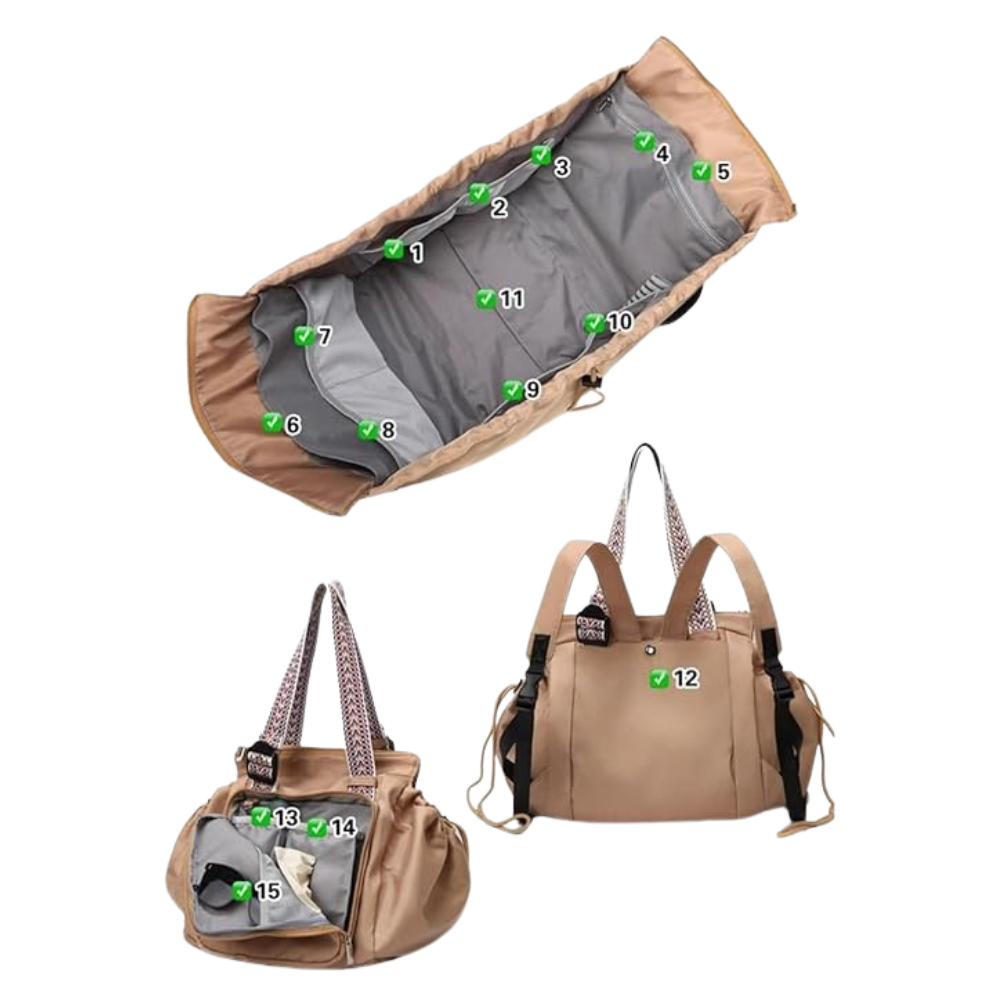 With 15 thoughtfully placed pockets, every item has its place — from daily essentials to larger must-haves. The smart layout keeps everything evenly distributed, so the bag stays comfortable and never feels bulky.